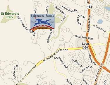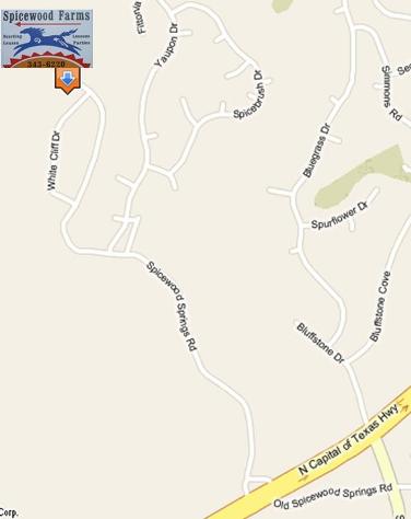 Directions: From Capital of Texas Highway (360): Turn northwest onto Spicewood Springs Road. Follow Spicewood Springs Road for 1.2 miles. Look for the Spicewood Farms sign, our farm is on the left hand side of the road, at the corner of White Cliff and Spicewood Springs. Turn left onto White Cliff, the entry to our farm is on your right at the back of the property. Please park your vehicle inside our gate.